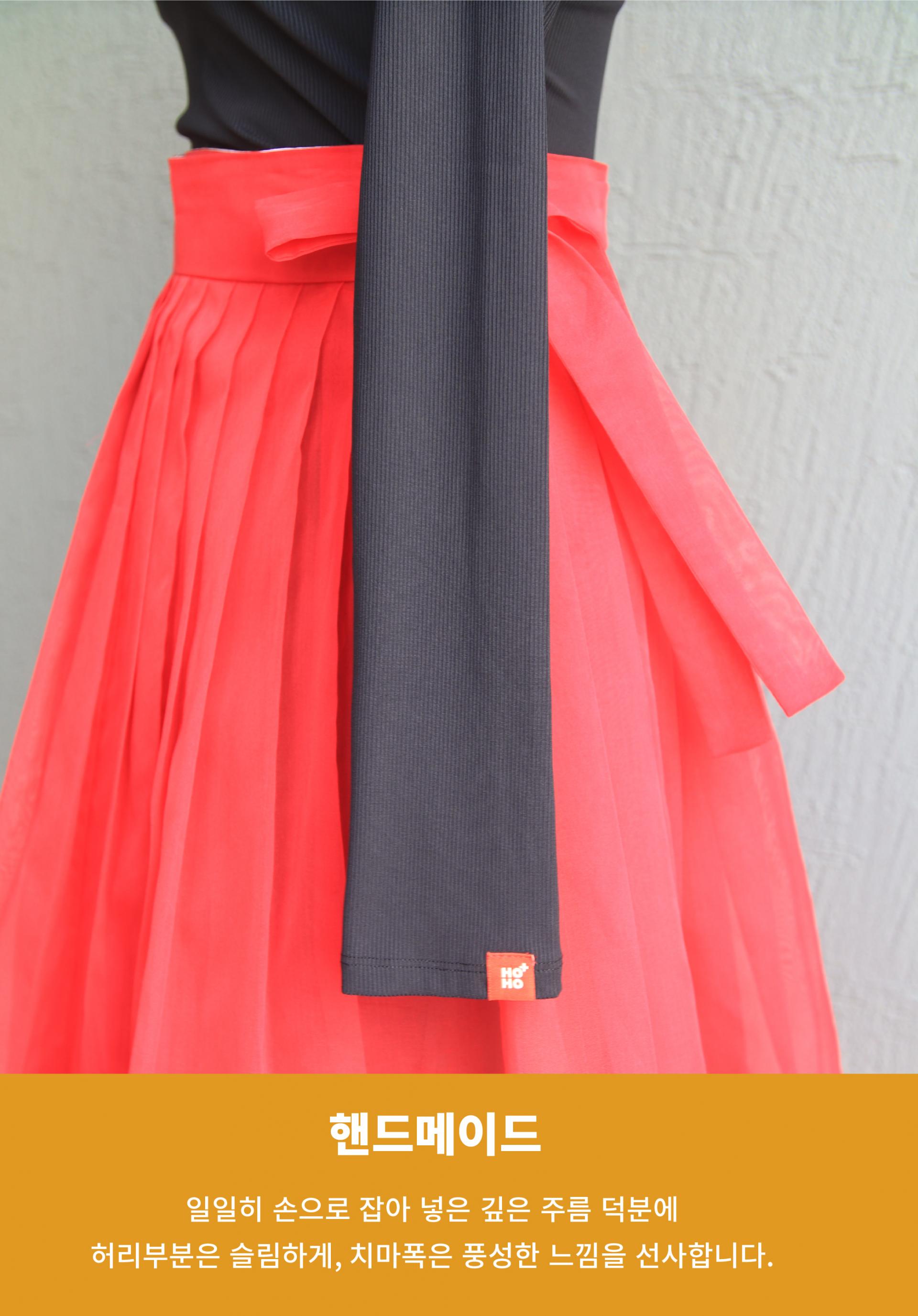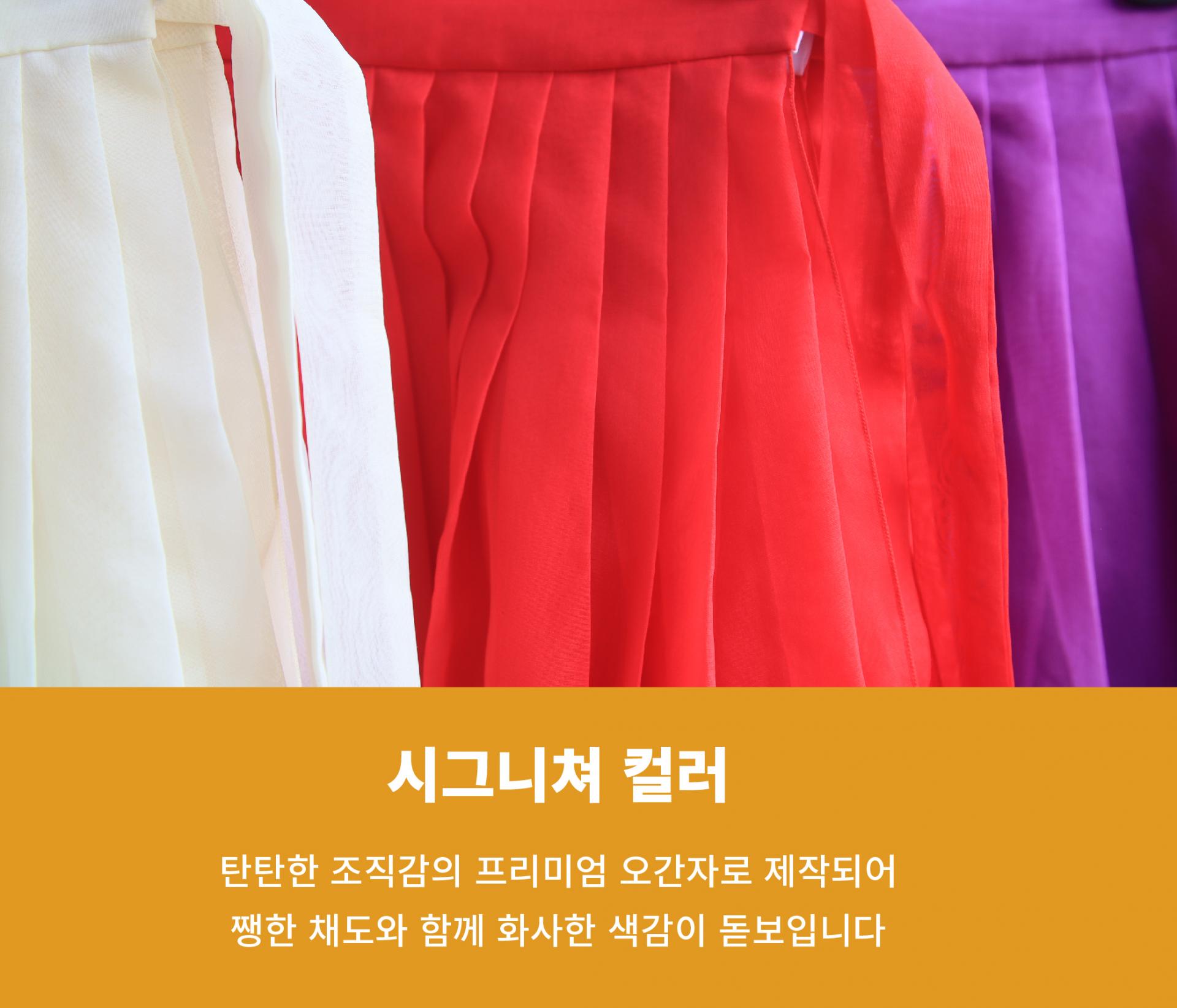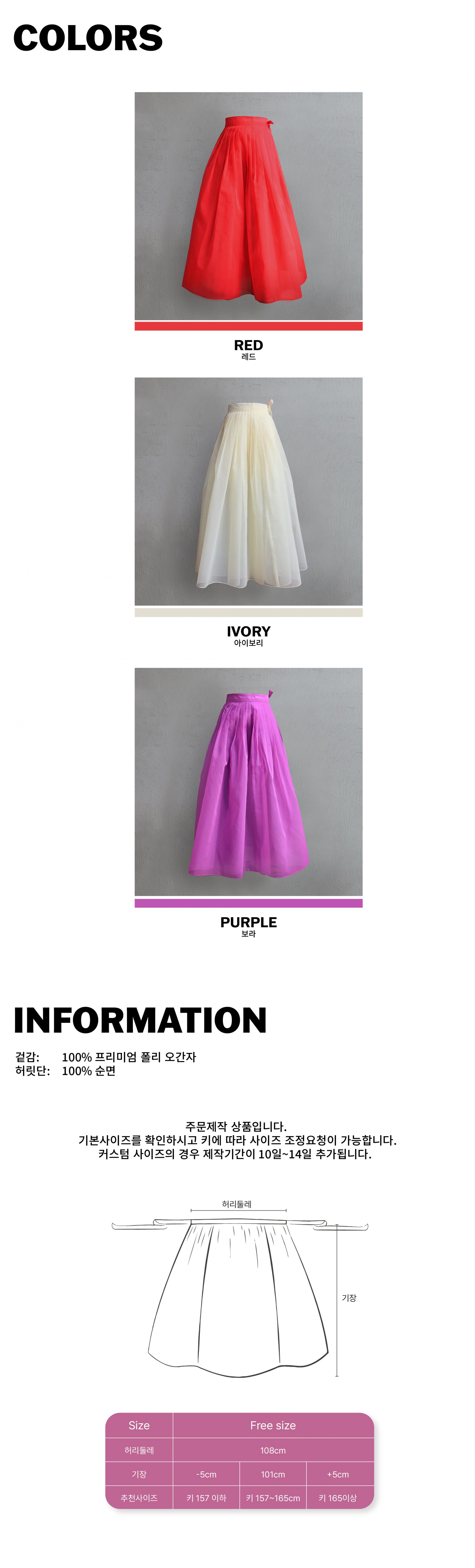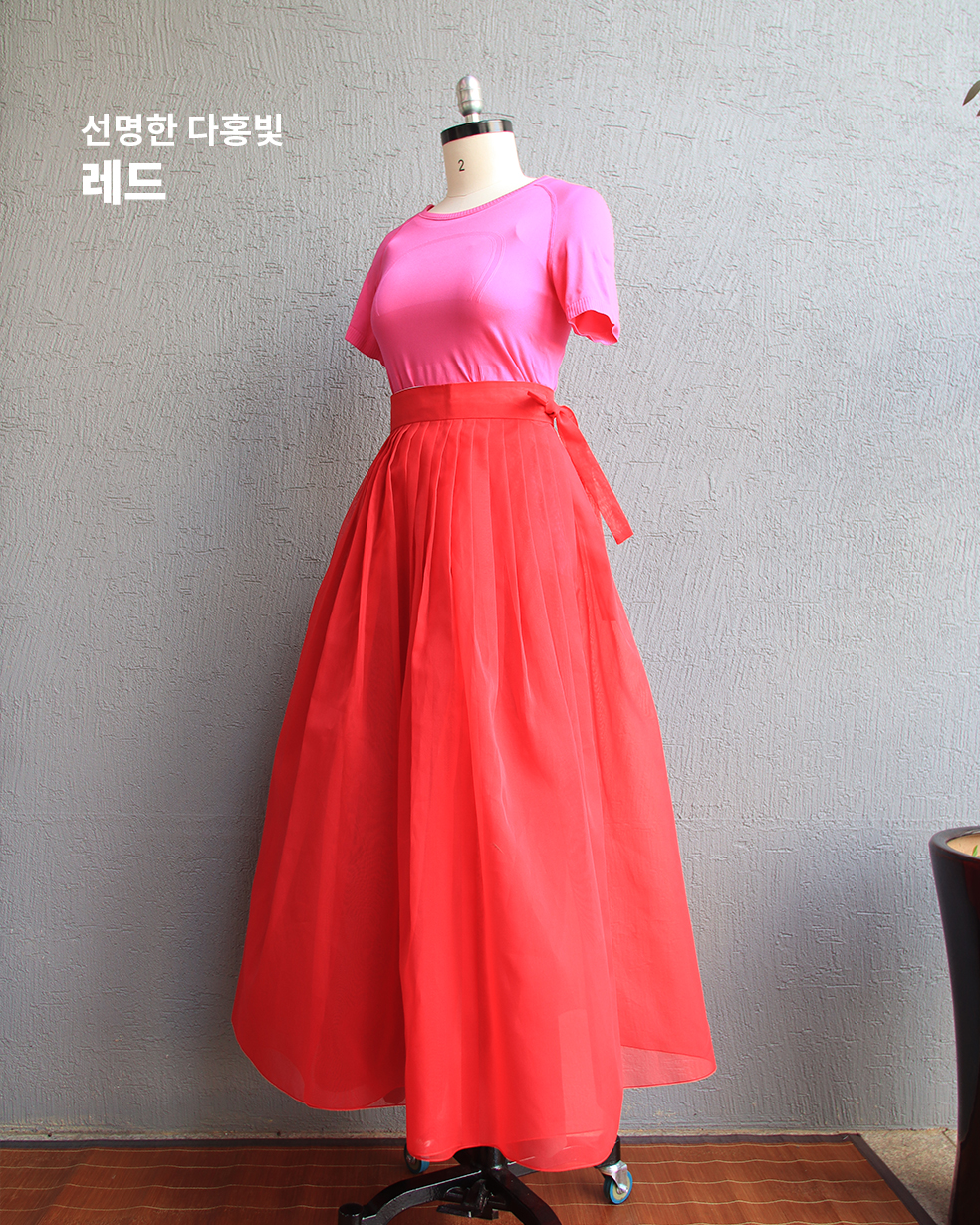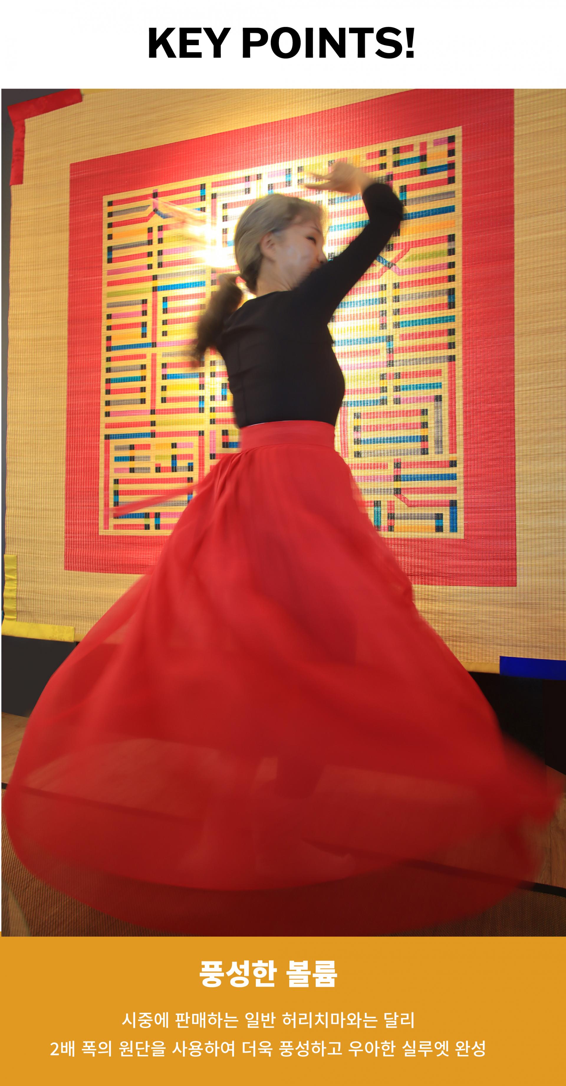 시중의 일반 허리치마보다 2배 많은 원단을 사용하여 패티코트 없이도 풍성하고 고급스러운 실루엣이 포인트!