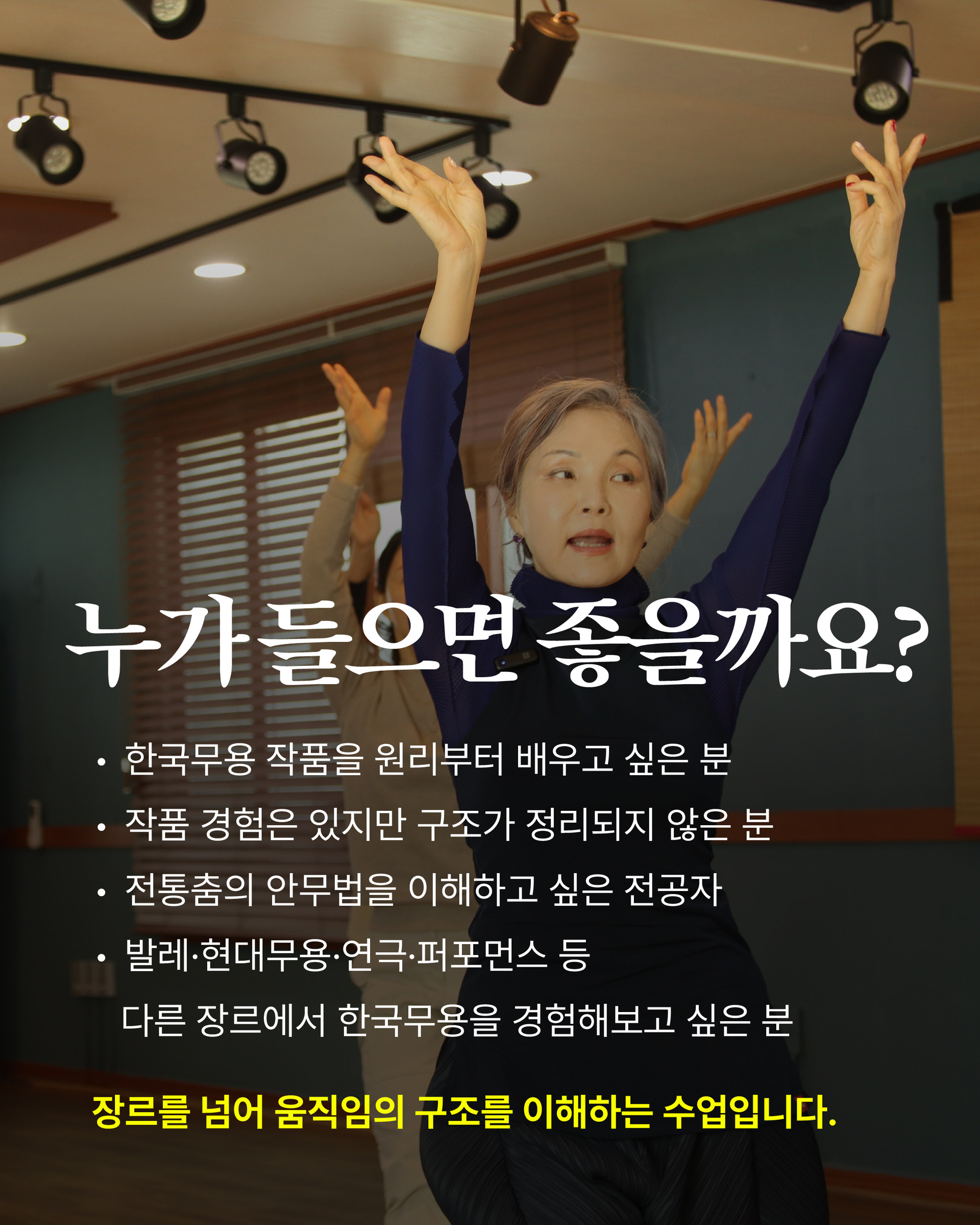 움직임 필수원리 특강을 수료했거나 한국무용 경험이 있는 분들께 특히 추천드립니다.
